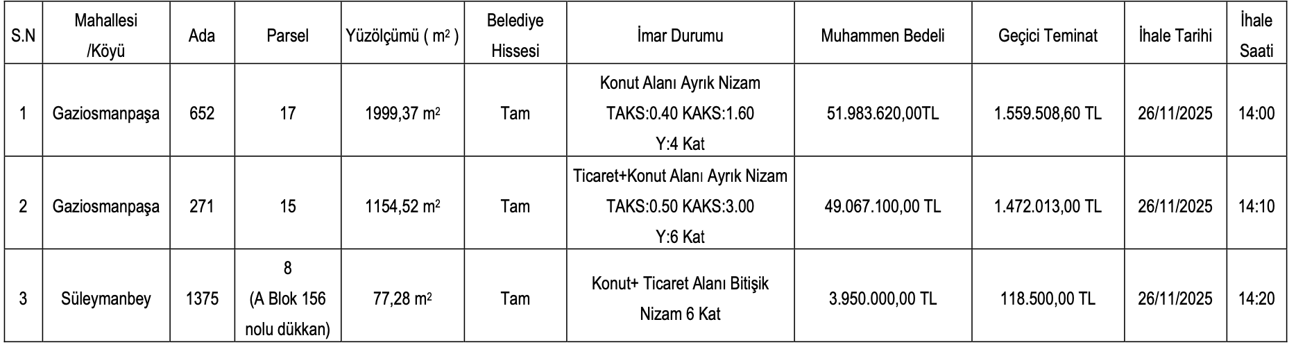 Gaziosmanpaşa ve Süleymanbey mahallelerinde yer alan arsaların satış ihaleleri 26 Kasım 2025 tarihinde saat 14.00 ile 14.20 arasında gerçekleştirilecek.