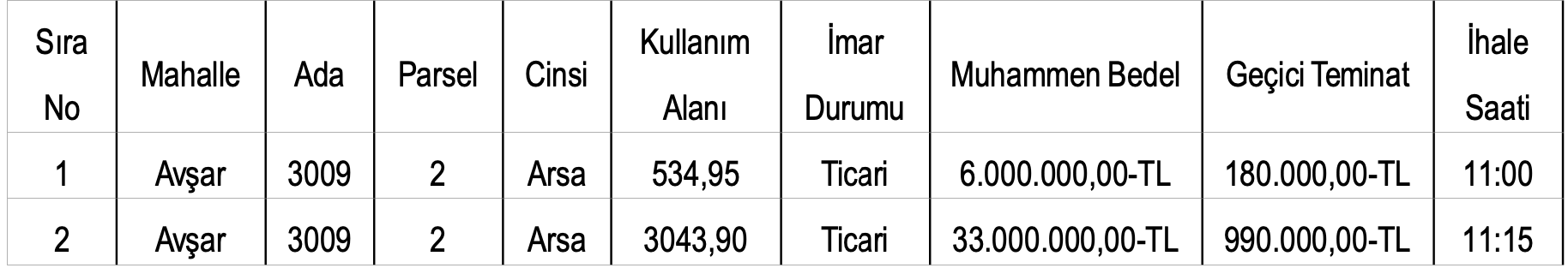 Mülkiyeti Turgutlu Belediyesine ait Manisa ili Turgutlu ilçesi Avşar mahallesinde arsa vasfıyla kayıtlı ada, parsel, imar durumu, m2, toplam muhammen bedeli ve geçici teminat tutarları belirtilen 2 adet arsanın satış işidir.