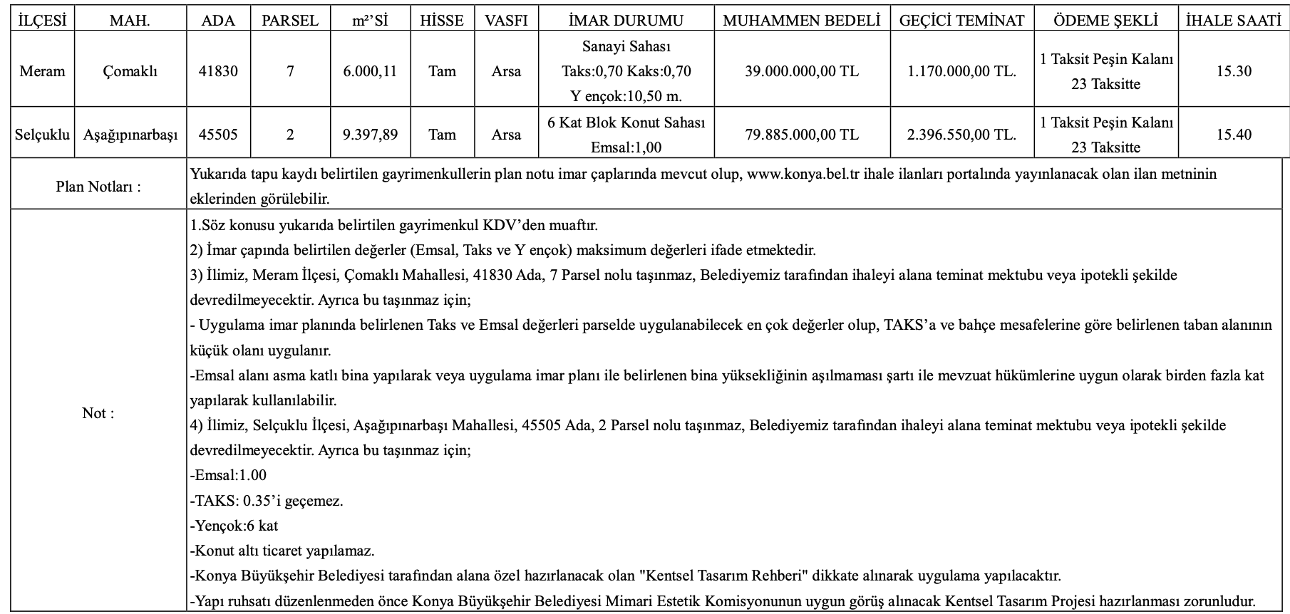 Konya’da yer alan arsaları sanayi sahası ve konut sahası imarlı olarak belirtildi. Söz konusu arsalar 6 bin 11 ve 9 bin 397,,89 metrekare alana sahip.