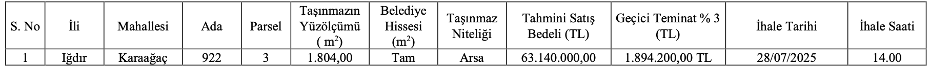 Iğdır’da yer alan arsa bin 804 metrekare alana sahip. Söz konusu arsanın muhammen bedeli 63 milyon 140 bin TL olarak geçici teminat bedeli ise 1 milyon 894 bin 200 TL olarak açıklandı.