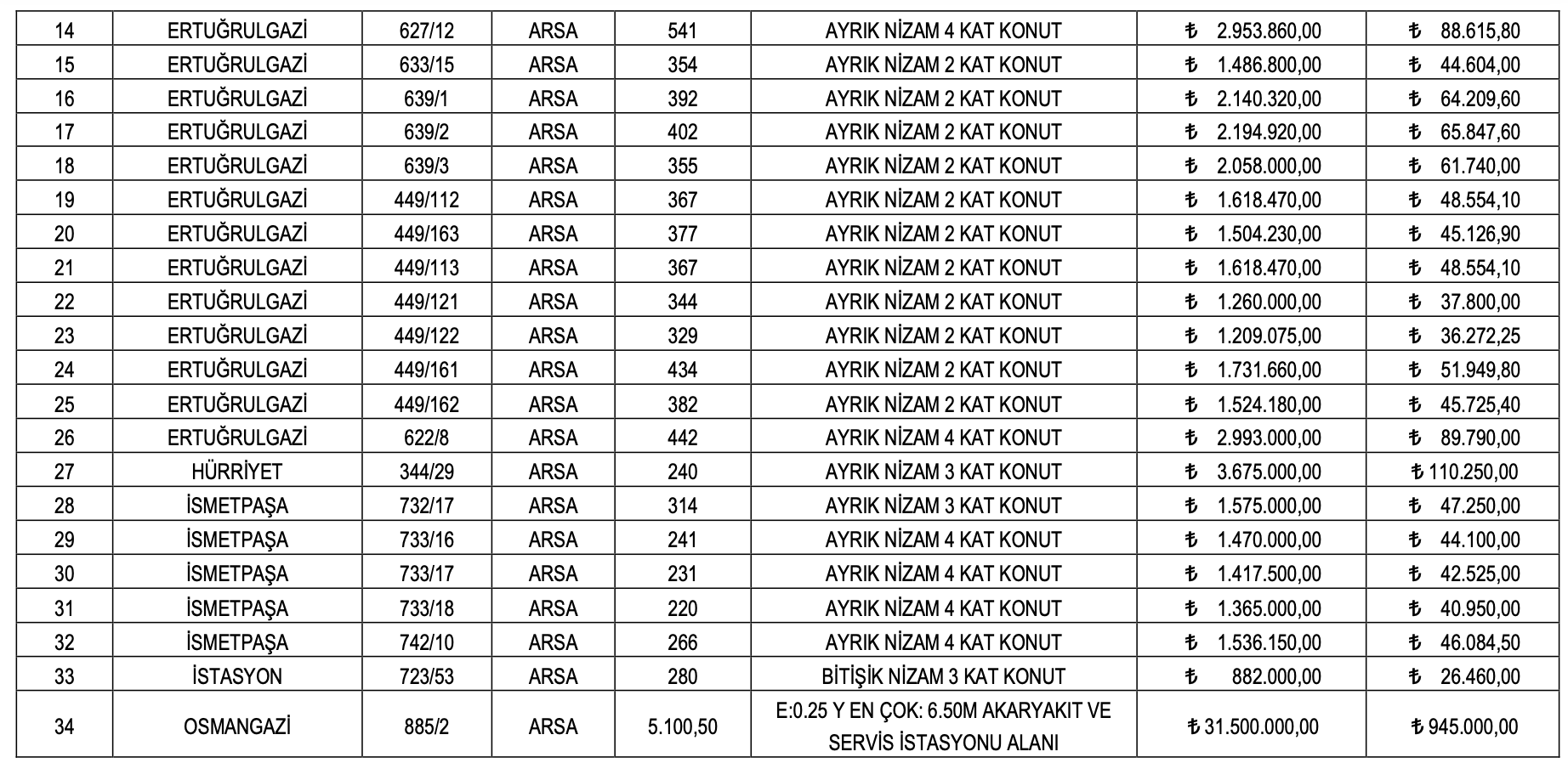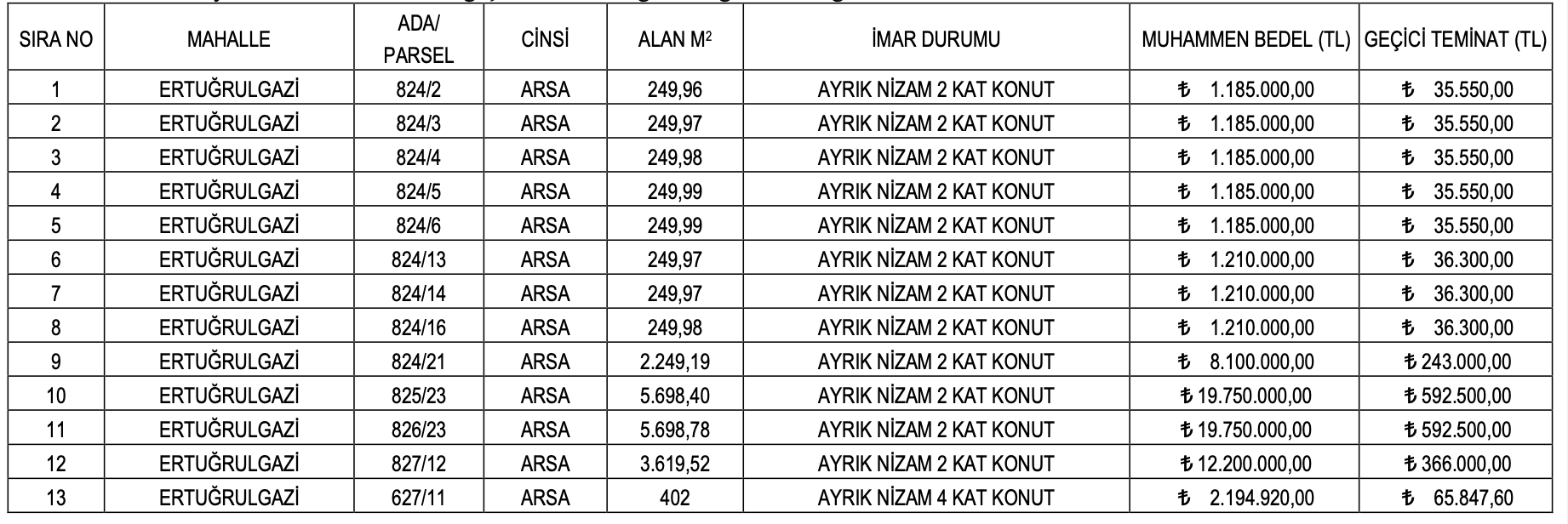 Söz konusu arsaların muhammen bedelleri 882 bin TL ile 19 milyon 750 bin TL arasında farklılık gösterirken, geçici teminat bedelleri ise 26 bin 460 TL ile 592 bin 500 TL arasında farklılık gösteriyor.