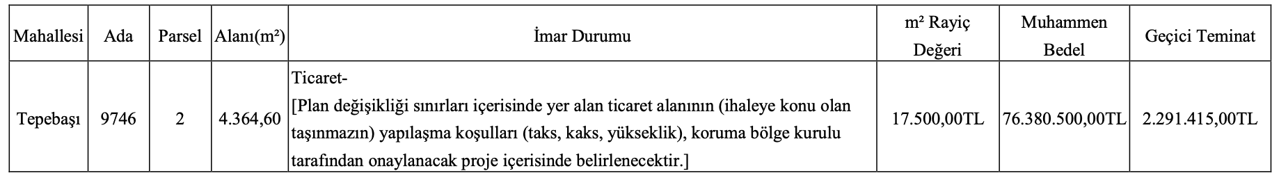 Söz konusu arsanın muhammen bedeli 76 milyon 380 bin 500 TL olarak belirtilirken, geçici teminat bedeli ise 2 milyon 291 bin 415 TL olarak açıklandı.
