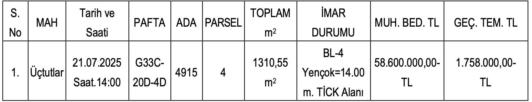 Üçtutlar mahallesinde yer alan arsanın satış ihalesi 21 Temmuz 2025 tarihinde saat 14.00’te gerçekleştirilecek.