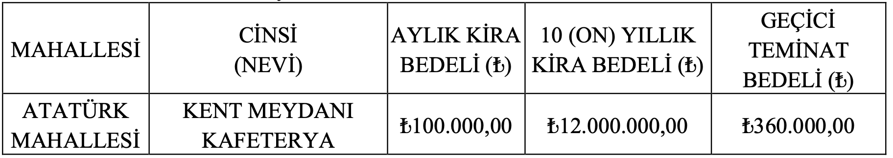 2- Kiraya verilecek Kent Meydanı Projesi kapsamında yapılan kafeterya binası zemin katı için Mahallesi, cinsi, yıllık kira bedeli, toplam kira bedeli ve geçici teminatı aşağıda çıkartılmıştır.