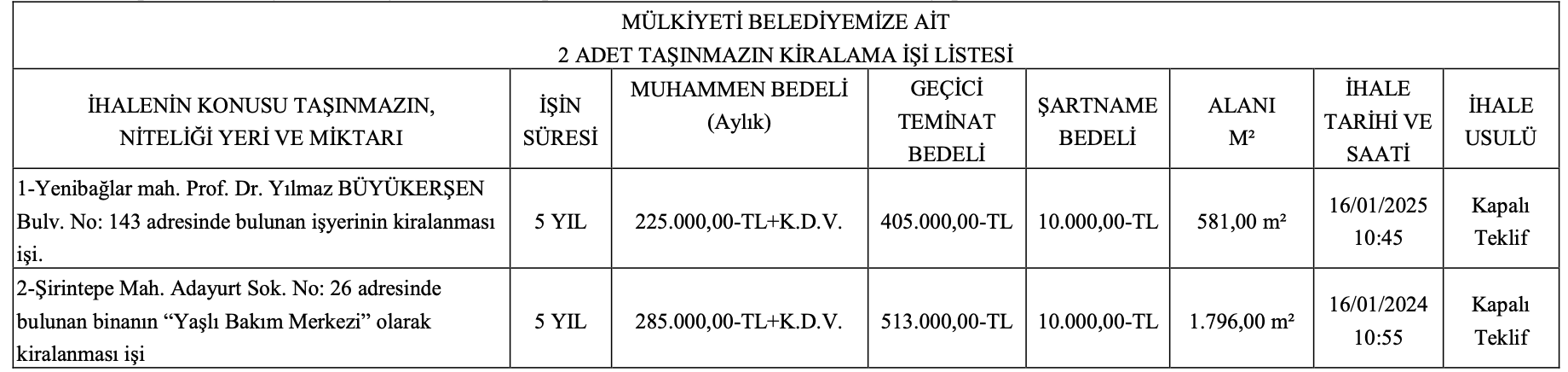 Kahramankazan Belediye Başkanlığı ve Tepebaşı Belediye Başkanlığı, Ankara ve Eskişehir’de yer alan üç adet gayrimenkul için kiralama ihalesi düzenliyor. Kiraya verilecek olan kafe, iş yeri ve yaşlı bakım merkezinin kira bedelleri ve ihale tarihleri tek tek açıklandı.