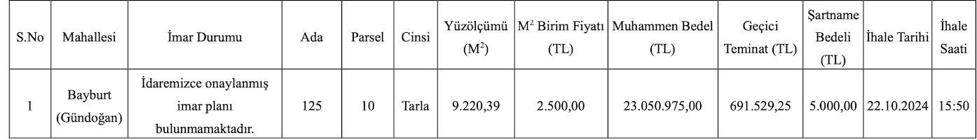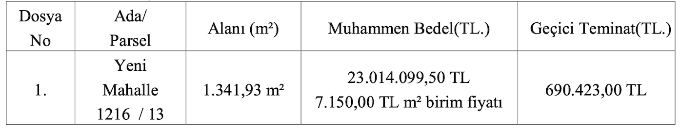 Metrekare birim fiyatının 2 bin 500 TL olarak açıklandığı arazinin muhammen bedeli 23 milyon 50 bin 975 TL, geçici teminat bedeli ise 691 bin 529,25 TL olarak açıklandı.