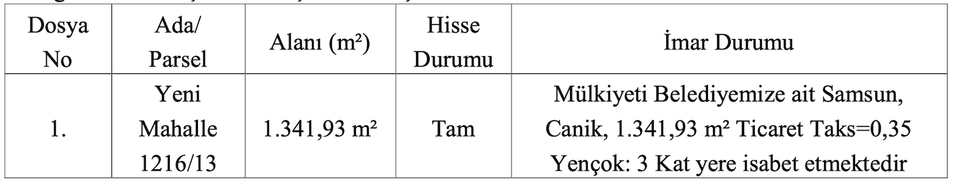 Canik Belediye Başkanlığı tarafından satışa çıkarılan arsa 1.341,93 metrekare alana sahip. Ticaret alanı imarlı arsanın muhammen bedeli 23 milyon 14 bin 99,50 TL olarak açıklanırken, geçici teminat bedeli ise 690 bin 423 TL olarak açıklandı.