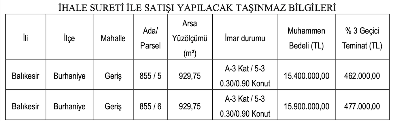 Konut imarlı arsaların muhammen bedelleri 15 milyon 400 bin TL ve 15 milyon 900 bin TL olarak açıklanırken, geçici teminat bedelleri de 462 bin TL ve 477 bin TL olarak açıklandı.