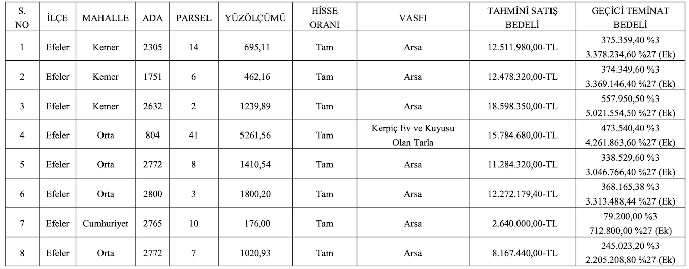 1- Mülkiyeti Aydın Büyükşehir Belediyesine ait yukarıdaki listede tapu bilgileri belirtilen taşınmazların, 2886 sayılı Devlet İhale Kanununun 45. maddesi uyarınca Açık Teklif Usulü ile satışı yapılacaktır.