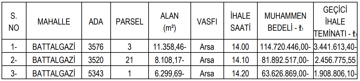 Battalgazi Mahallesindeki arsa vasıflı taşınmazlarımızın ihalesine katılacak istekliler