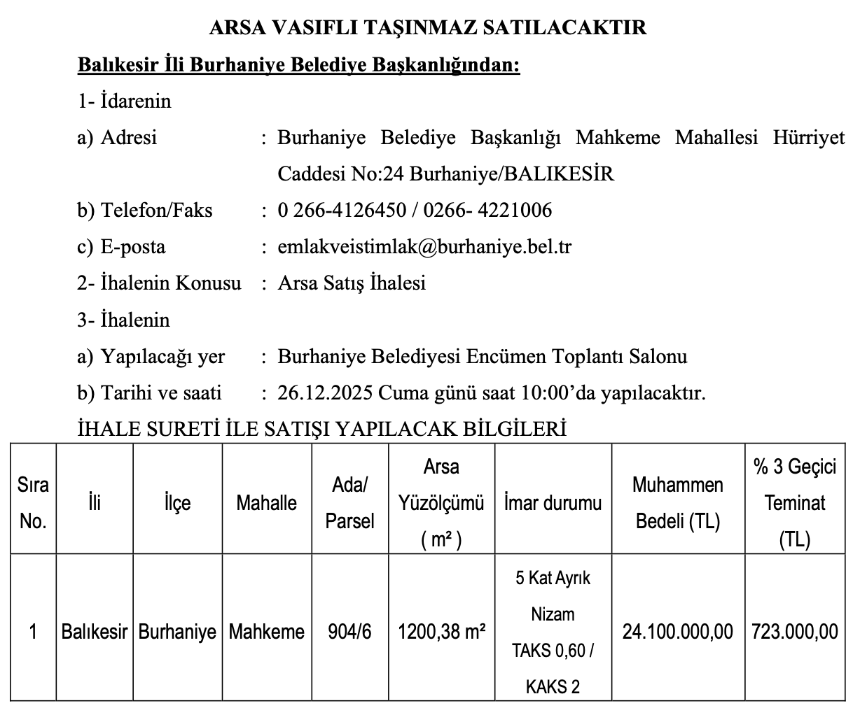 4-Mülkiyeti Burhaniye Belediyesine ait Balıkesir İli, Burhaniye İlçesi Mahkeme Mahallesinde bulunan ve yukarıdaki tabloda tapu bilgileri, muhammen bedeli, geçici teminat tutarı belirtilen arsa vasıflı taşınmaz, Burhaniye Belediye Meclisinin 03.12.2025 tarih ve 2025/275 sayılı kararına istinaden ve Burhaniye Belediye Encümeninin 10.12.2025 tarih ve 2025/2428 sayılı kararı doğrultusunda, 2886 Sayılı Devlet İhale Kanununun 45’inci maddesi çerçevesinde şartname esasları dâhilinde Açık Arttırma Usulü ile satış ihalesi yapılacaktır.