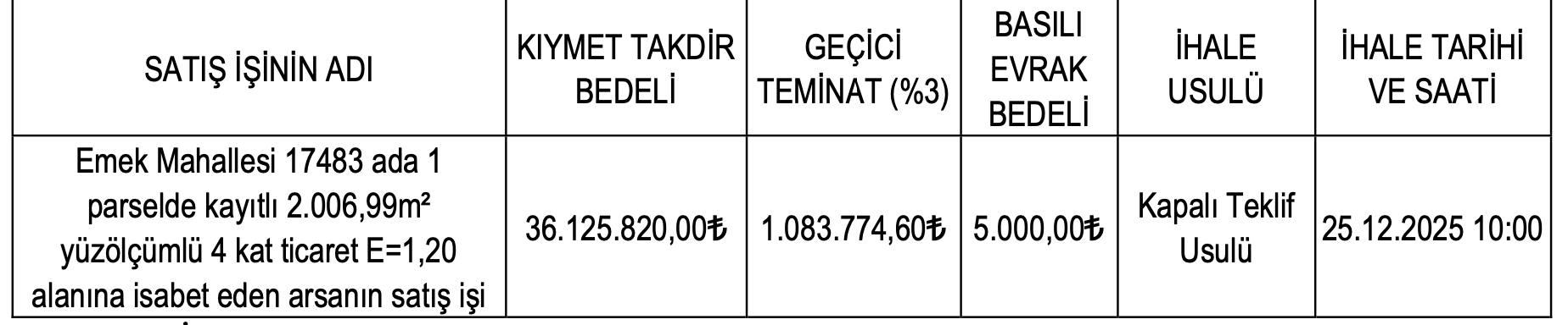 Emek Mahallesi’nde yer alan 4 kat ticaret imarlı arsanın satış ihalesi yarın saat 10.00’da yapılacak.