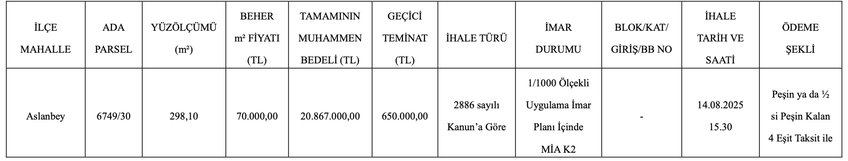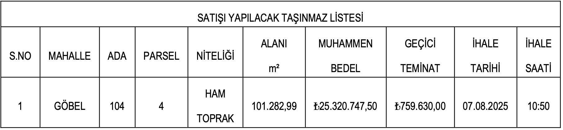 Arazinin satış ihalesi 7 Ağustos 2025 tarihinde saat 10.50’de gerçekleştirilecek.