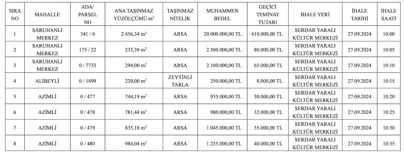 Saruhanlı Belediye Başkanlığı tarafından satışa çıkarılan arsa ve arazilerin muhammen bedelleri 250 bin TL ile 20 milyon TL arasında değişiyor. Gayrimenkullerin satış ihalesi 27 Eylül’de yapılacak.