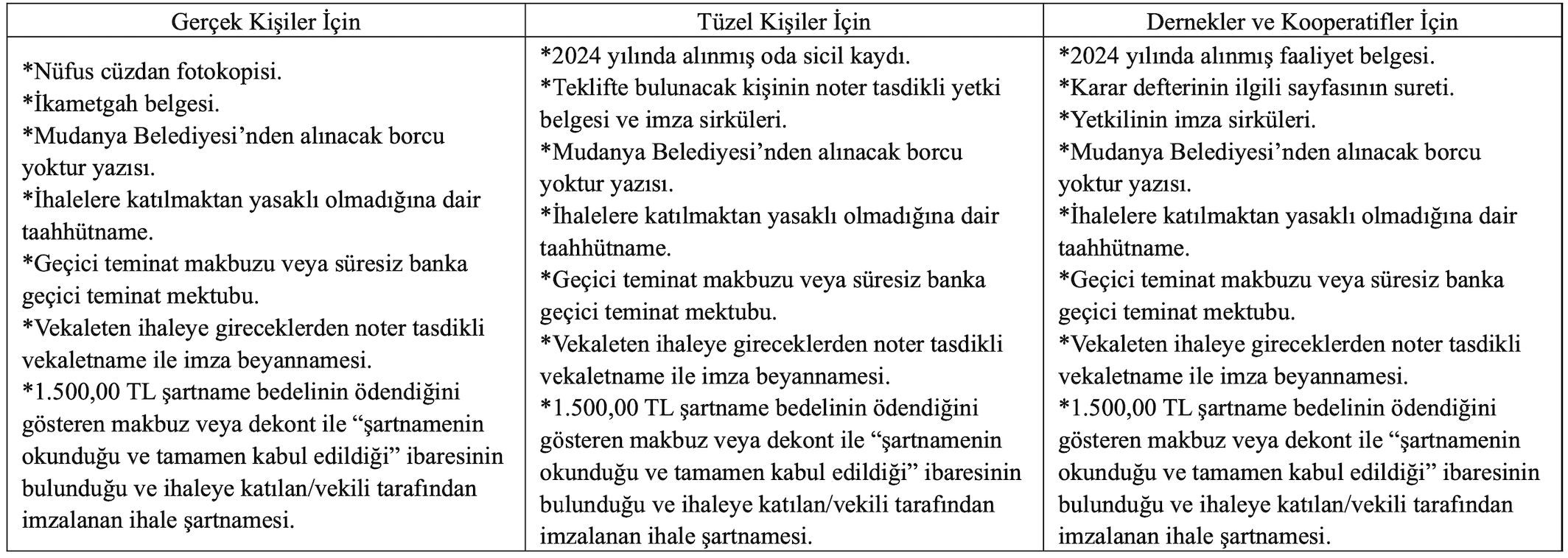 5- İhaleye iştirak edecek isteklilerin ihale gün ve saatinde Mudanya Belediyesi Yıldıztepe Sosyal Yaşam Merkezi’nde bulunan başkanlık makamı toplantı salonunda hazır bulunmaları gerekmektedir.