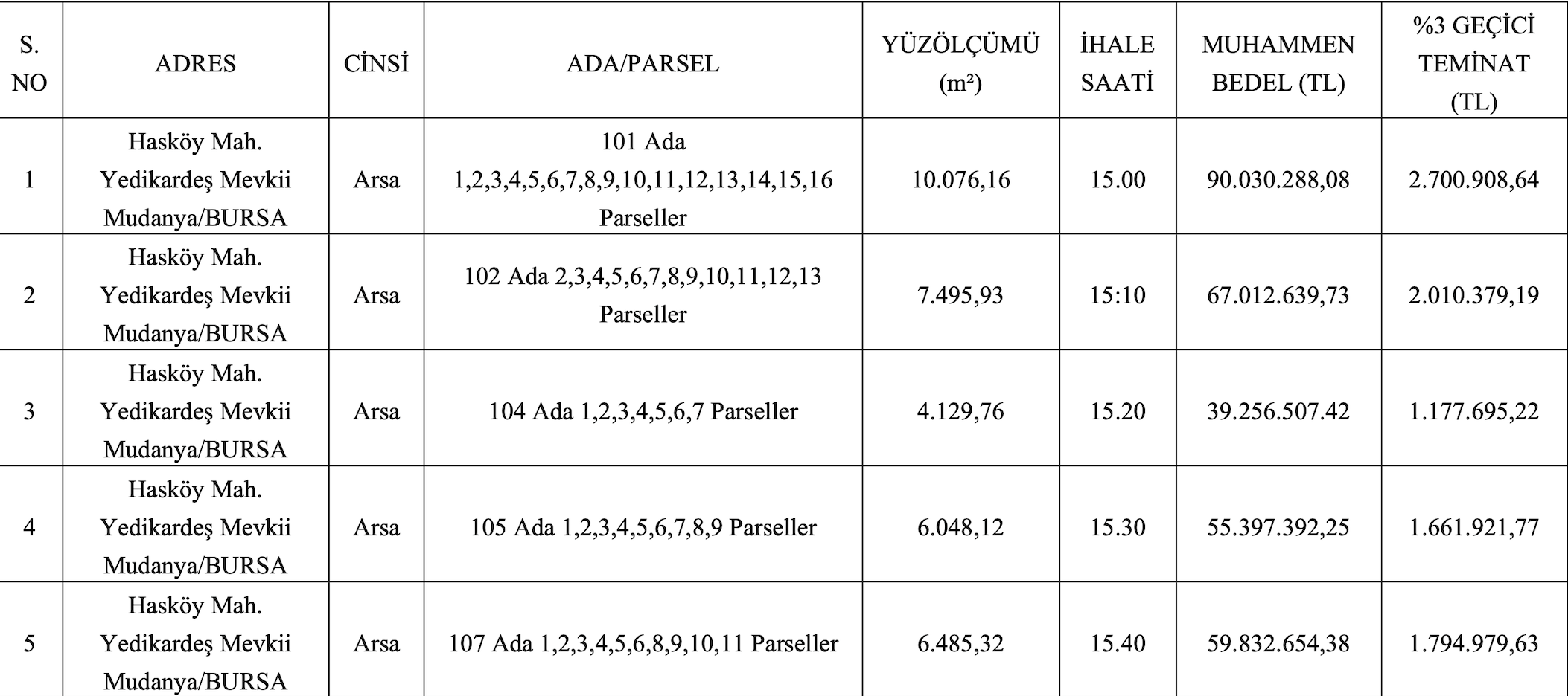 Mudanya Belediye Başkanlığı tarafından satışa çıkarılan arsaların muhammen bedelleri 39 milyon 256 bin 507 TL ile 90 milyon 30 bin 288 TL arasında değişiyor. Arsaların satış ihalesi 11 Eylül’de gerçekleştirilecek.