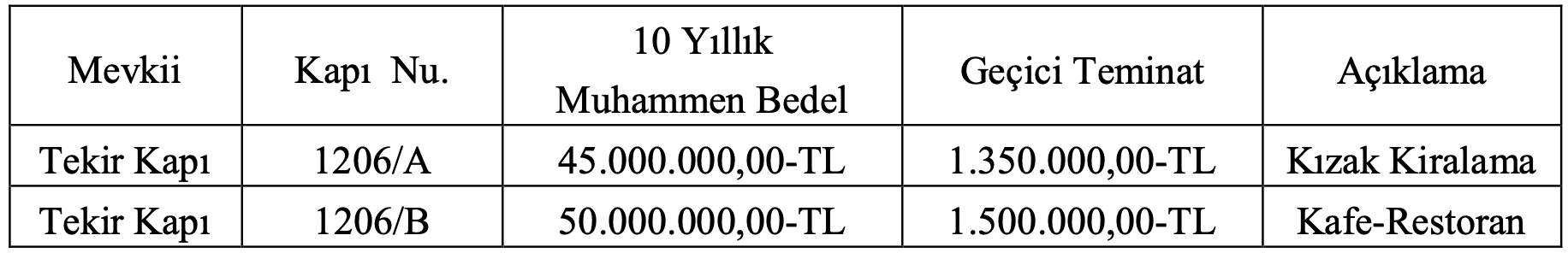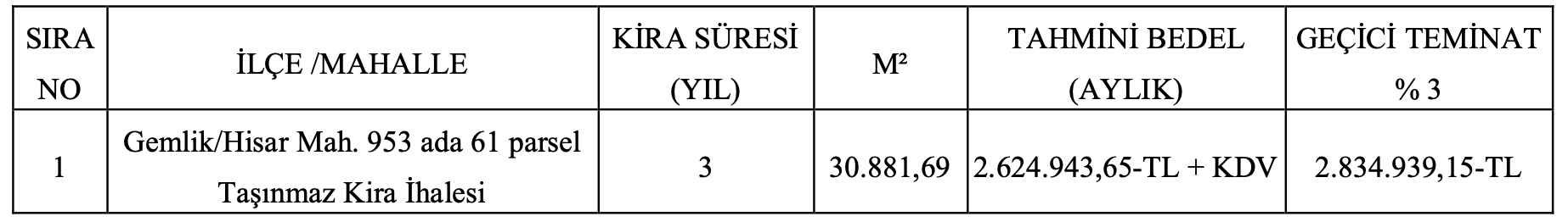Bursa Gemlik’te yer alan gayrimenkulün kira süresi 3 yıl olarak açıklandı. 30 bin 881,69 metrekare alana sahip gayrimenkulün aylık tahmini kira bedeli 2 milyon 624 bin 943,65 TL olarak açıklanırken, geçici teminat bedeli ise 2 milyon 834 bin 939,15 TL şeklinde açıklandı.
