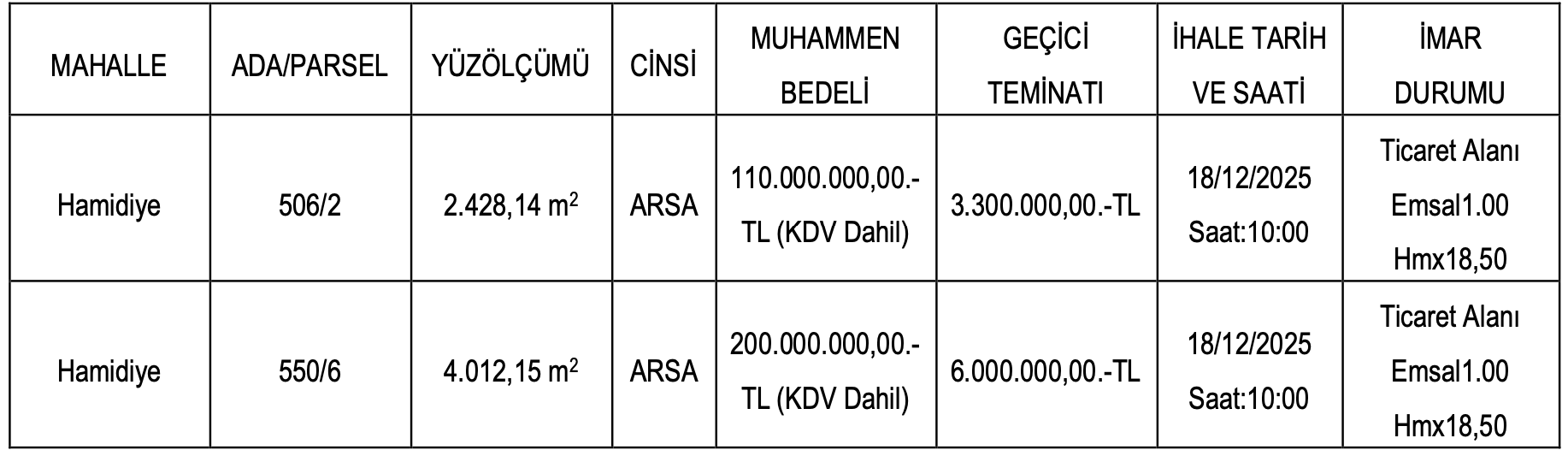 Ticaret alanı imarlı arsaların satış ihaleleri 18 Aralık 2025 tarihinde saat 10.00’da yapılacak.