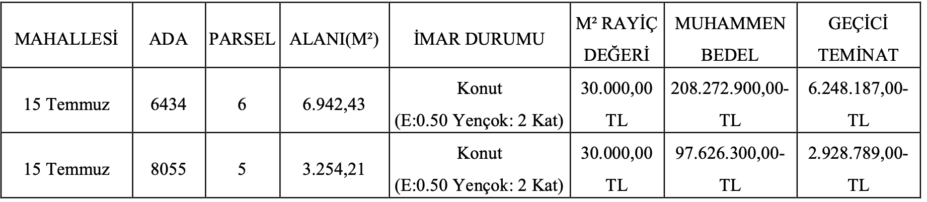 Söz konusu arsaların muhammen bedelleri 208 milyon 272 bin 900 TL ve 97 milyon 626 bin 300 TL olarak belirtilirken, geçici teminat bedelleri ise 6 milyon 248 bin 187 TL ve 2 milyon 928 bin 789 TL olarak belirtildi.
