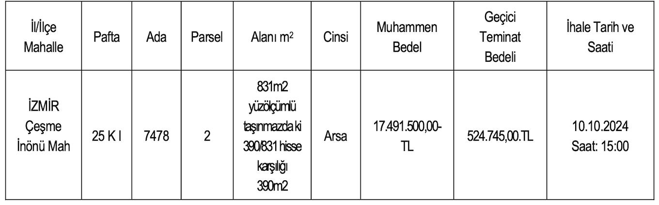 İzmir ve Tokat’ta yer alan iki adet arsa için satış ihalesi düzenliyor. Çeşme Belediye Başkanlığı tarafından satışa çıkarılan arsa 831 metrekare alana sahip.