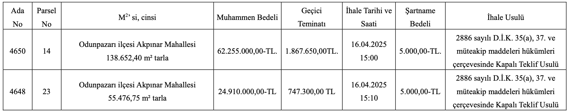 Eskişehir Odunpazarı’nda yer alan arazilerin muhammen bedelleri 62 milyon 255 bin TL ve 24 milyon 910 bin TL olarak açıklanırken, geçici teminat bedelleri ise 1 milyon 867 bin 650 TL ve 747 bin 300 TL olarak açıklandı.