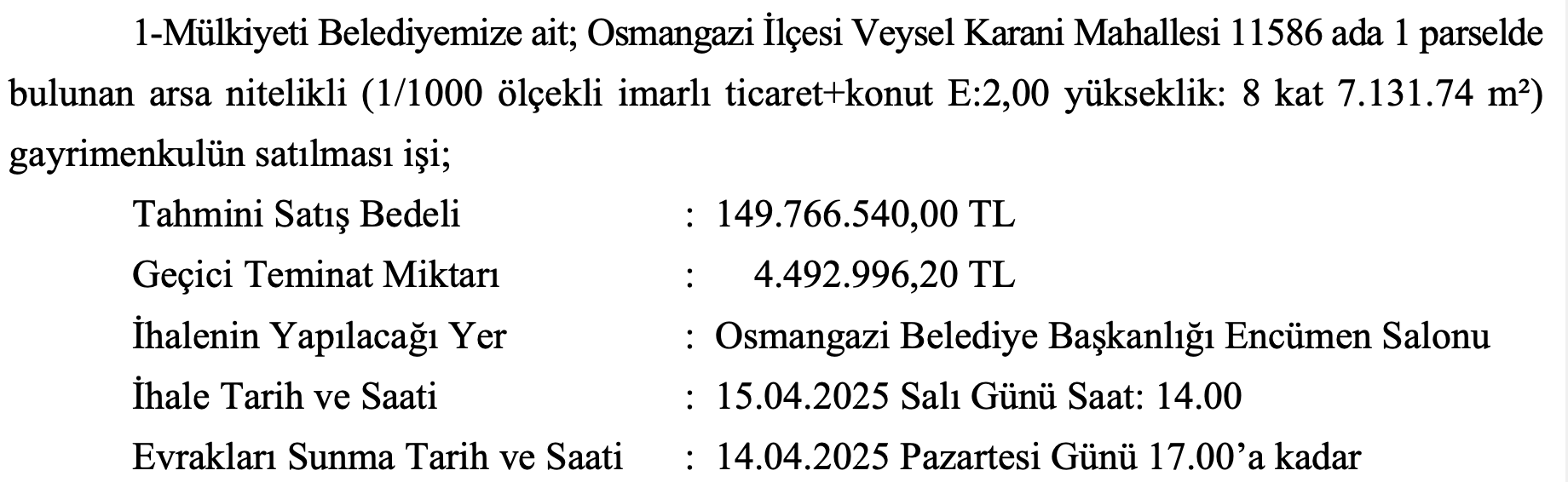 Veysel Karani Mahallesi’nde yer alan arsanın satış ihalesi 15 Nisan 2025 tarihinde saat 14.00’te Osmangazi Belediye Başkanlığı Encümen Salonu’nda yapılacak.