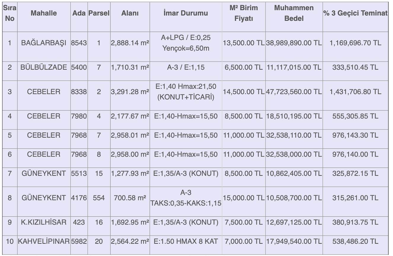 Muhammen bedelleri 10 milyon 508 bin 700 TL ile 47 milyon 723 bin 560 TL arasında değişen arsaların geçici teminat bedelleri ise 315 bin 261 TL ile 1 milyon 431 bin 706,80 TL arasında değişiyor.