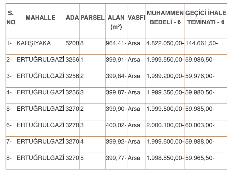 Açık teklif (açık arttırma) usulü ile satışa çıkan Karşıyaka ve Ertuğrulgazi Mahallesindeki arsa vasıflı gayrimenkullerimizin ihale ile ilgili ilan, vergi, resim ve harçları alıcısı tarafından peşin olarak Belediye veznesine yatırılacaktır.