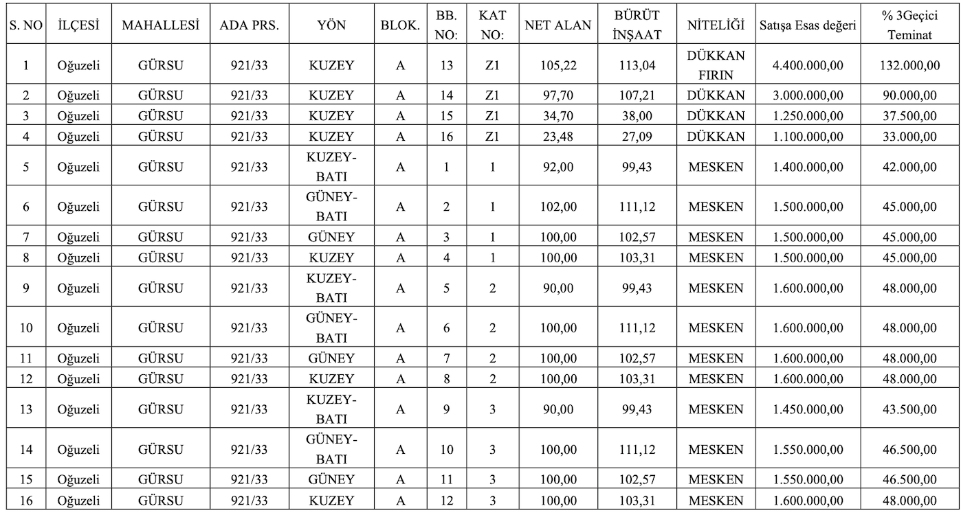 Gaziantep Oğuzeli’nde yer alan konutların muhammen bedelleri 1 milyon 400 bin TL ile 1 milyon 600 bin TL arasında, geçici teminat bedelleri 42 bin TL ile 48 bin TL arasında değişirken, iş yerlerinin muhammen bedelleri 1 milyon 100 bin TL ile 4 milyon 400 bin TL arasında geçici teminat bedelleri ise 33 bin TL ile 132 bin TL arasında değişiyor.