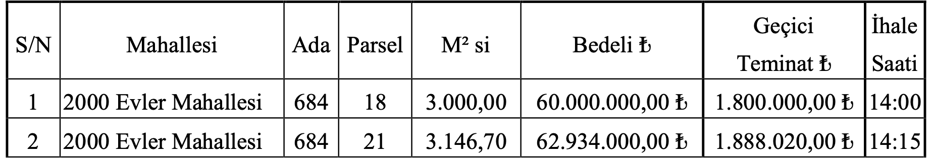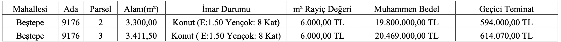 Arsaların muhammen bedelleri 19 milyon 800 bin TL ve 20 milyon 469 bin TL şeklinde belirtilirken, geçici teminat bedelleri ise 594 bin TL ve 614 bin 70 TL şeklinde belirtildi.