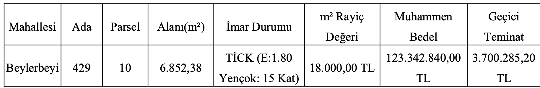 gerek gördüğü takdirde 2886 sayılı Kanununun 40. maddesi gereğince sözlü veya yazılı teklif almak suretiyle ihaleyi sonuçlandıracaktır. Taşınmazlar KDV kapsamında değildir, İhale ve sözleşmeler ile ilgili vergi, resim, harç ile diğer resmi giderler, ihale üzerinde kalan kişilerce ödenir. Taşınmaz üzerinde alacaklısı T.C. Çevre Şehircilik ve İklim Değişikliği Bakanlığı Kentsel Dönüşüm Başkanlığı’nın borç: 59.349.452,05 TL