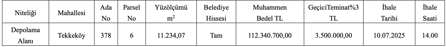 Belediyemize ait aşağıda ihale tarihi, ihale saati, niteliği, mevkii, muhammen bedeli, geçici teminatı belirtilen taşınmaz, Tekkeköy Belediyesi Meclis Salonunda Encümen huzurunda 10.07.2025 Perşembe günü saat 14.00’de, 2886 sayılı Devlet ihale Kanununun 35/a maddesine göre kapalı teklif açık artırma usulü ile satışı yapılacaktır.