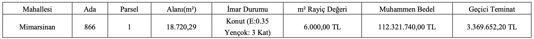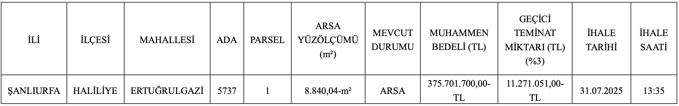 Şanlıurfa Haliliye’de yer alan arsa 8 bin 840,04 metrekare alana sahip. Söz konusu arsanın muhammen bedeli 375 milyon 701 bin 700 TL olarak açıklanırken, geçici teminat bedeli ise 11 milyon 271 bin 51 TL olarak açıklandı.
