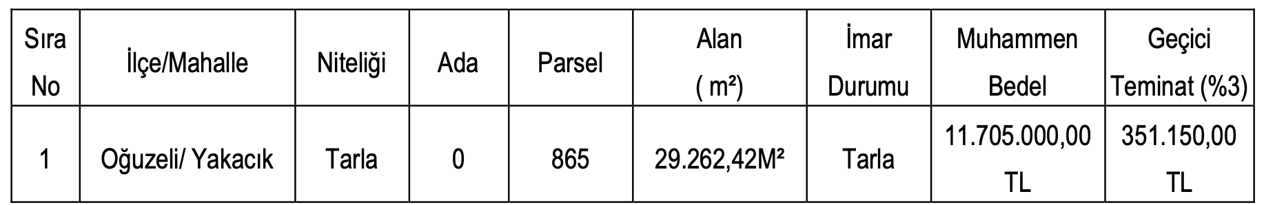 Söz konusu arazinin muhammen bedeli 11 milyon 705 bin TL olarak belirtilirken, geçici teminat bedeli ise 351 bin 150 TL olarak belirtildi.