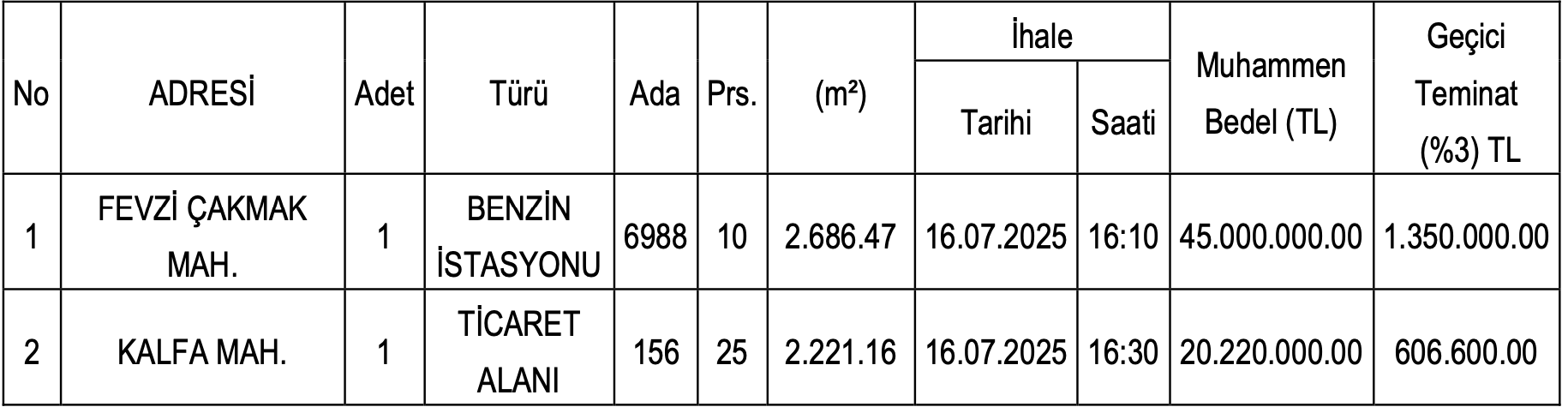 Fevzi Çakmak ve Kalfa Mahallesi’nde yer alan arsaların satış ihaleleri 16 Temmuz 2025 tarihinde saat 16.10 ve 16.30’da gerçekleştirilecek.