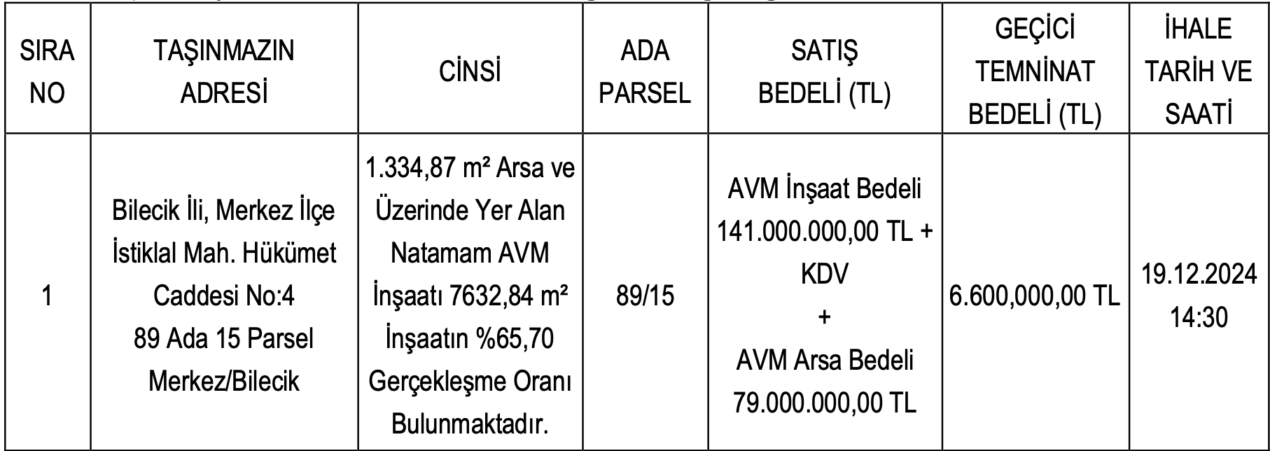 Bilecik Merkez’de yer alan bin 344,87 metrekare arsa ve üzerinde yer alan natamam AVM için inşaat bedeli 141 milyon TL, AVM arsa bedeli ise 79 milyon TL olarak açıklanırken, geçici teminat bedeli ise 6 milyon 600 bin TL olarak açıklandı.