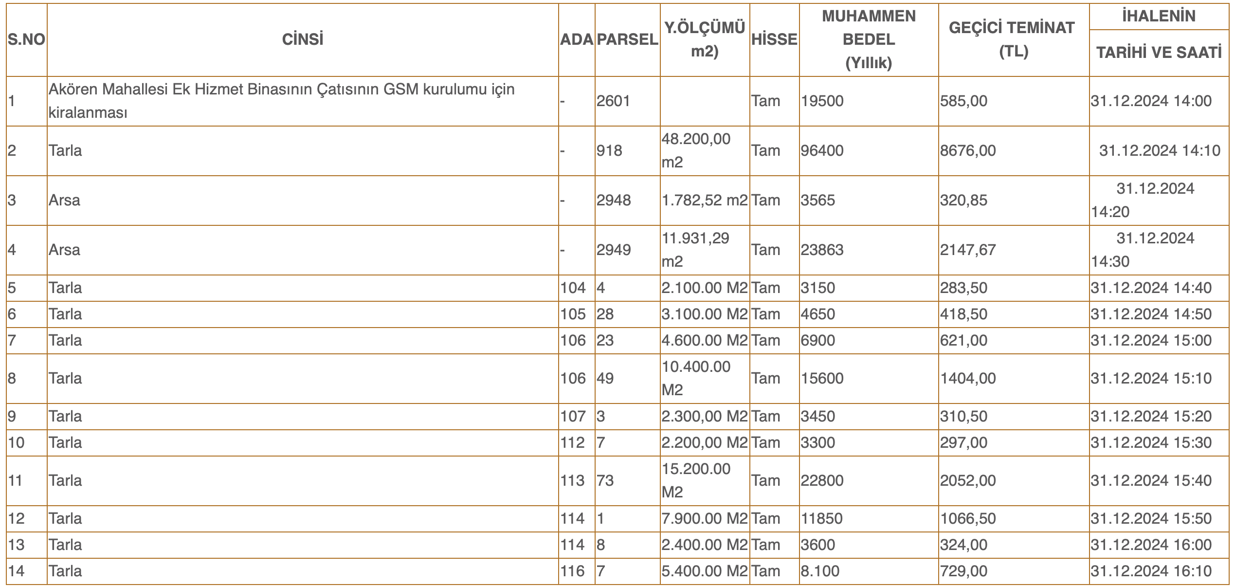 31.12.2024 günü Belediye Hizmet Binasında encümen huzurunda yapılacaktır.