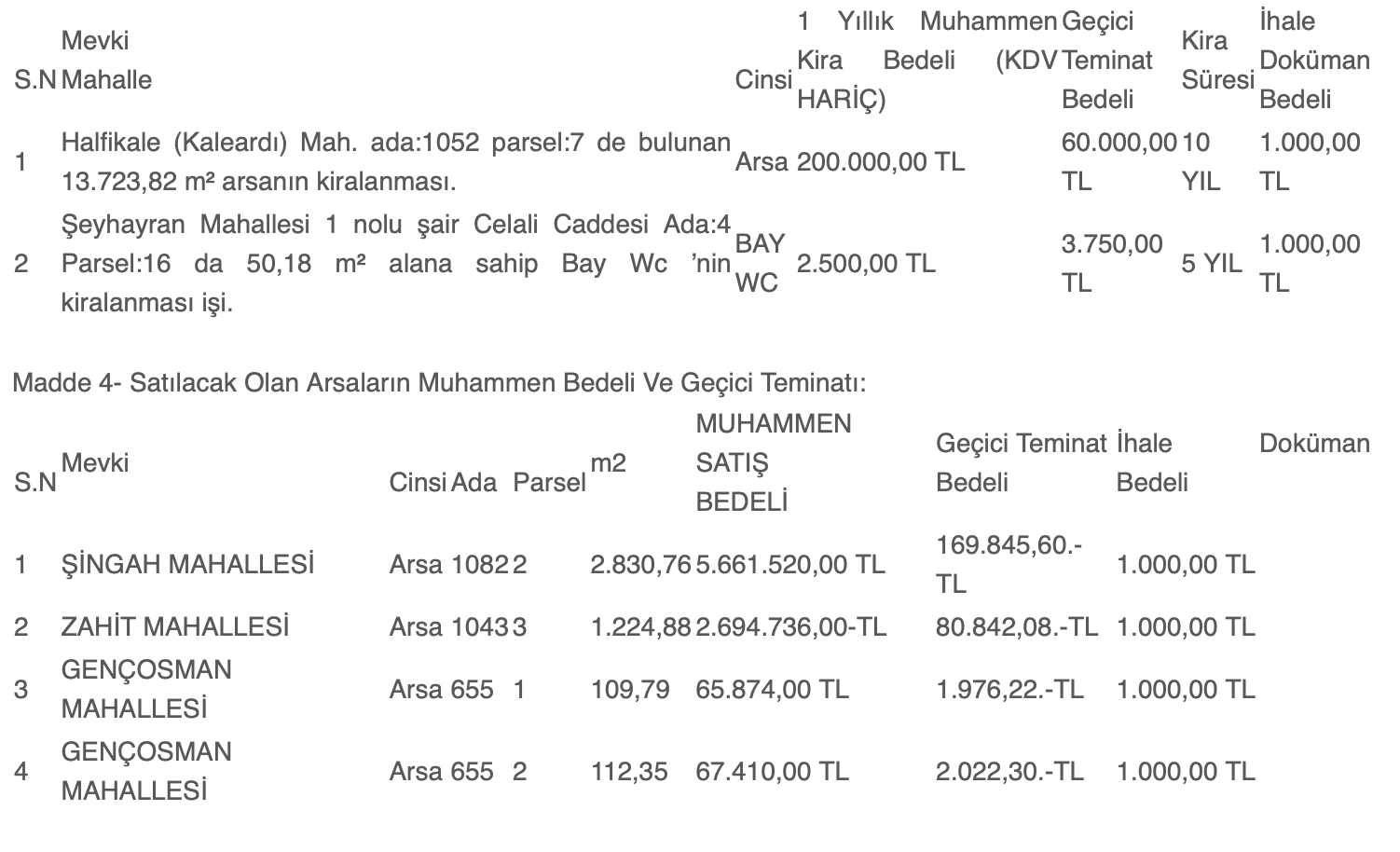 Madde 3- Kiraya Verilecek Olan yerlere ait Muhammen Bedeller ve Geçici Teminatlar:
