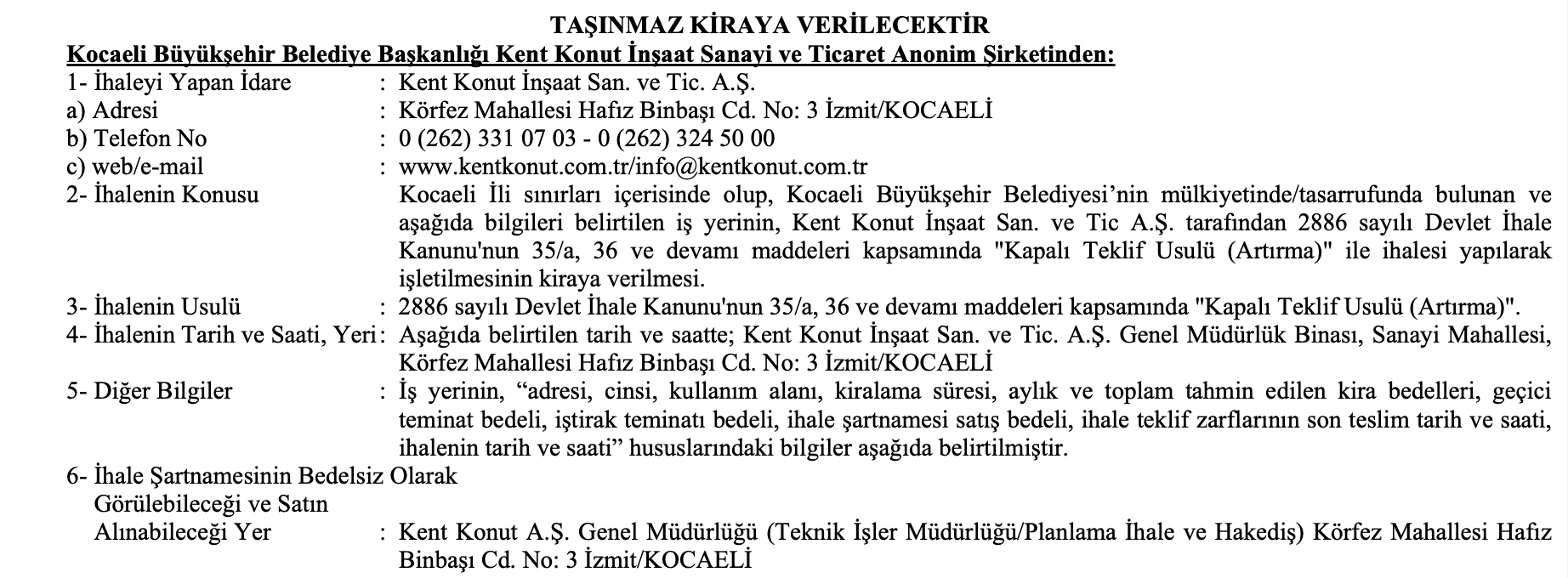 120 ay kiraya verilecek olan iş yerinin kiralama ihalesi 18 Şubat 2025 tarihinde saat 14.00’te Kent Konut İnşaat San. ve Tic. A.Ş. Genel Müdürlük Binası’nda yapılacak.