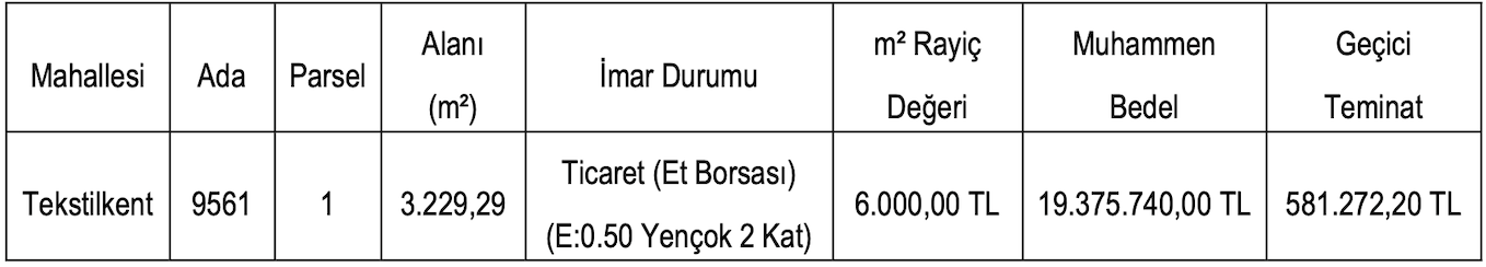 İhaleye konu taşınmaz 1/1000 ölçekli imar planında ticaret (et borsası) alanında kalması nedeniyle bu taşınmazın ihalesine et borsası sektöründe faaliyet gösteren kasaplar, şirketler, kooperatifler vb. işletmeciler katılabilecektir.