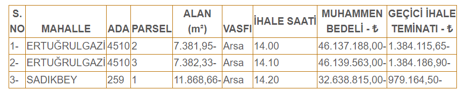 Kapalı teklif (kapalı zarf) usulü ile satışa çıkan Ertuğrulgazi ve Sadıkbey Mahallelerindeki arsa vasıflı gayrimenkullerimiz 3065 sayılı Katma Değer Vergisi Kanununun 17/p maddesine göre K.D.V.’ den istisna olup, ihale ile ilgili ilan, vergi, resim ve harçları alıcısı tarafından peşin olarak Belediye veznesine yatırılacaktır.