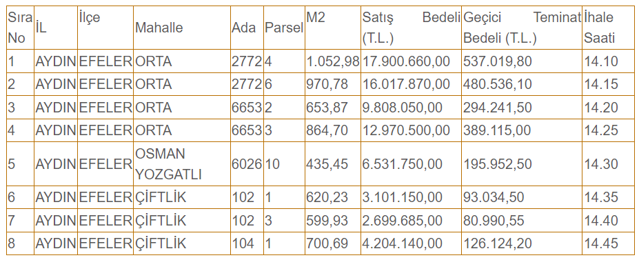 Efeler Belediyesi tarafından satışa çıkarılan ve Aydın Efeler'de yer alan arsaların ise muhammen bedelleri 2 milyon 699 bin 685 TL ile 17 milyon 900 bin 660 TL arasında değişirken, geçici teminat bedelleri ise 80 bin 990 TL ile 537 bin 19 TL arasında değişiyor.