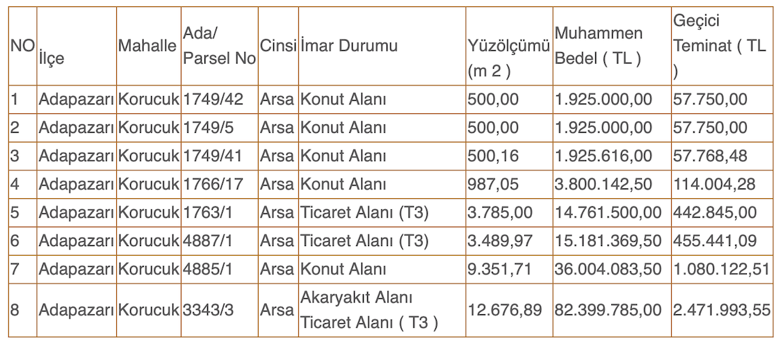 Adapazarı Belediye Başkanlığı tarafından satışa çıkarılan arsaların muhammen bedelleri 1 milyon 925 bin TL ile 82 milyon 399 bin 785 TL arasında değişiyor.