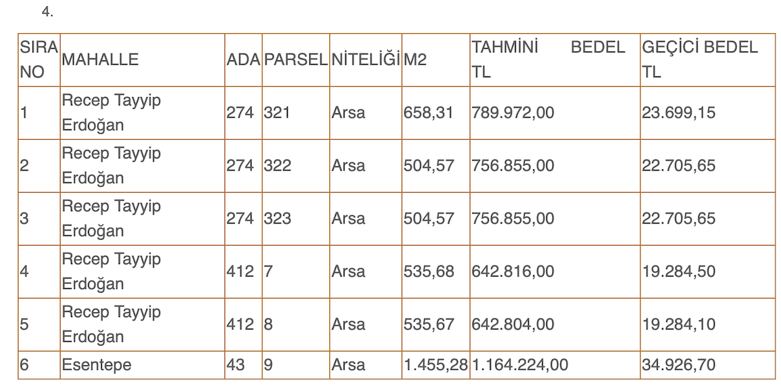1. İlçemiz Recep Tayyip Erdoğan ve Esentepe Mahallerinde bulunan mülkiyeti Belediye Başkanlığımıza ait olan 6 Adet Arsa vasfındaki taşınmazların satışı yapılacaktır.