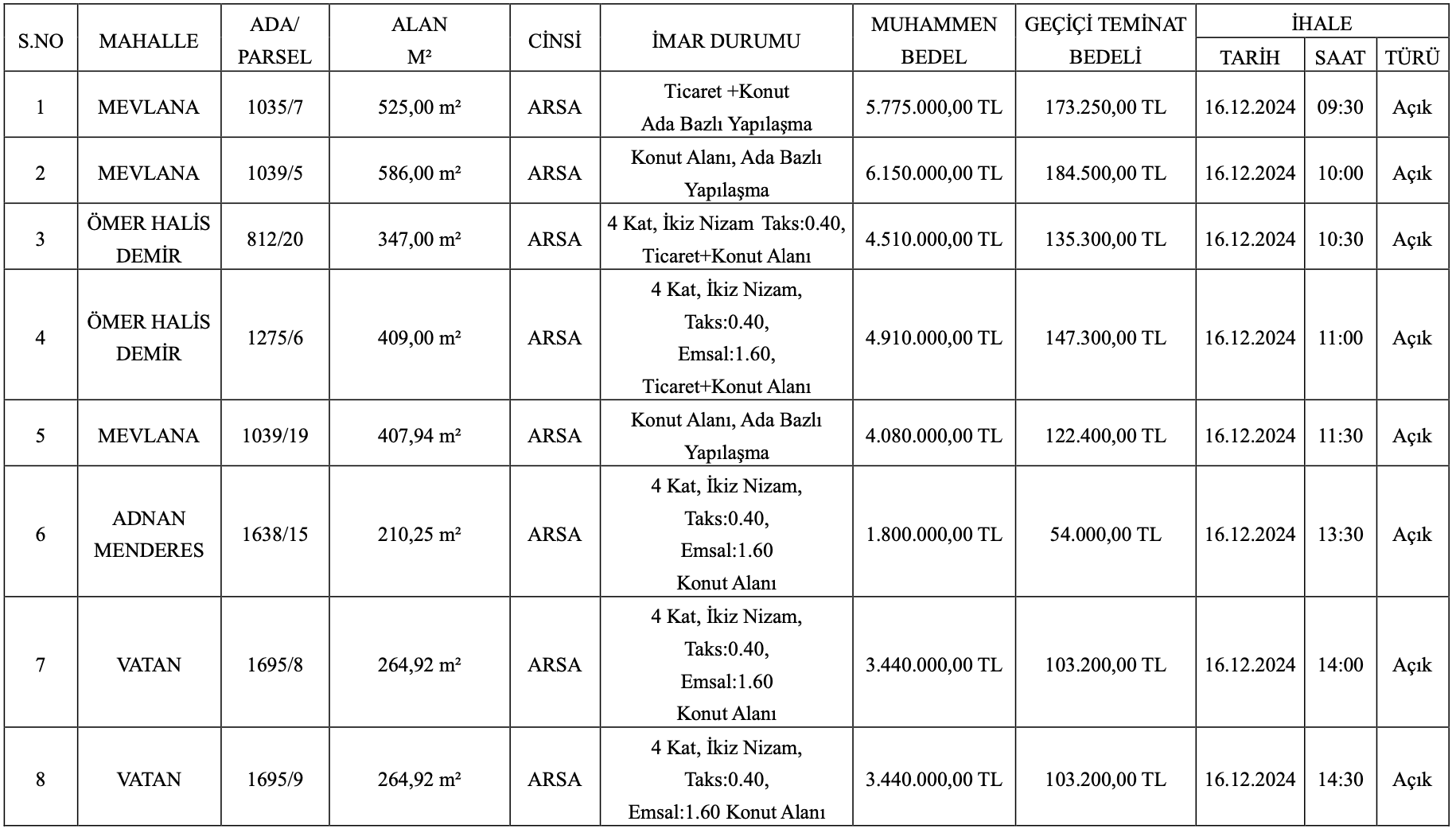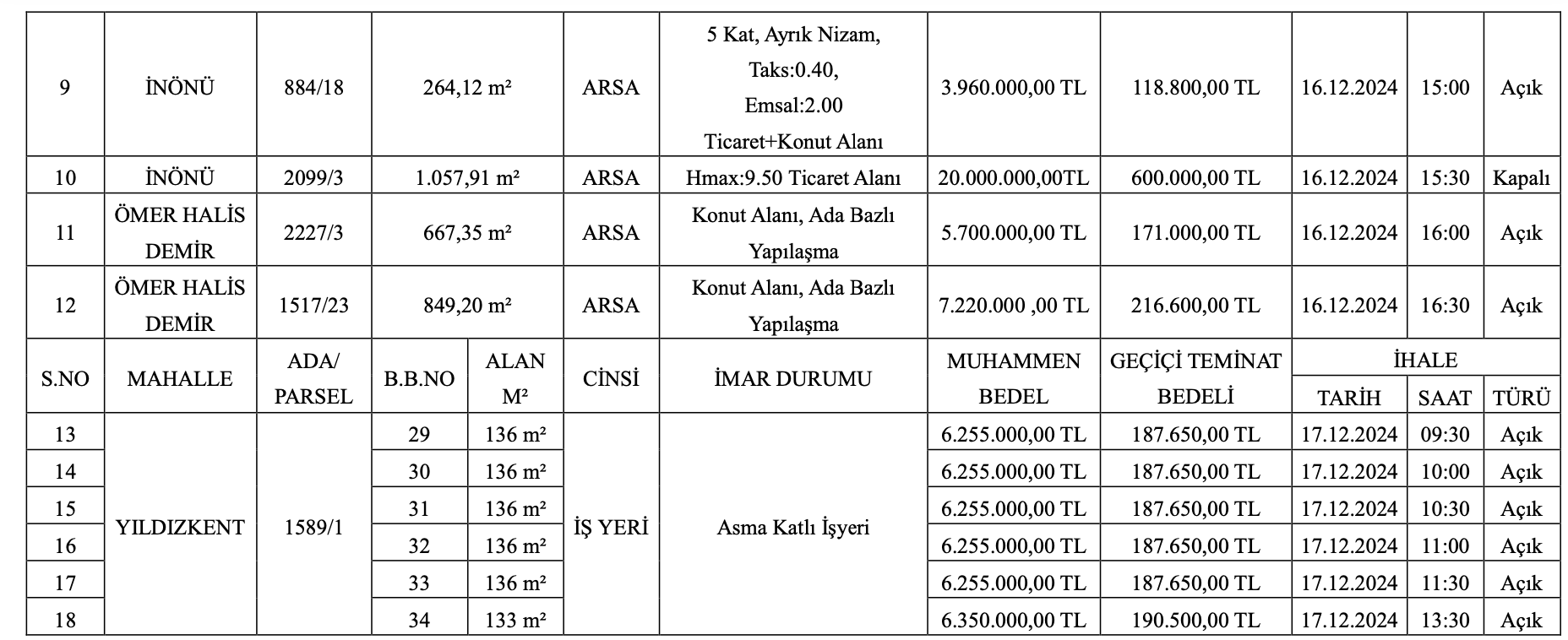 Arsaların satış ihalesi 16 Aralık tarihinde saat 09.30 ile 16.30 arasında, iş yerlerinin satış ihalesi ise 17 Aralık tarihlerinde saat 09.30 ile 13.30 arasında gerçekleştirilecek.