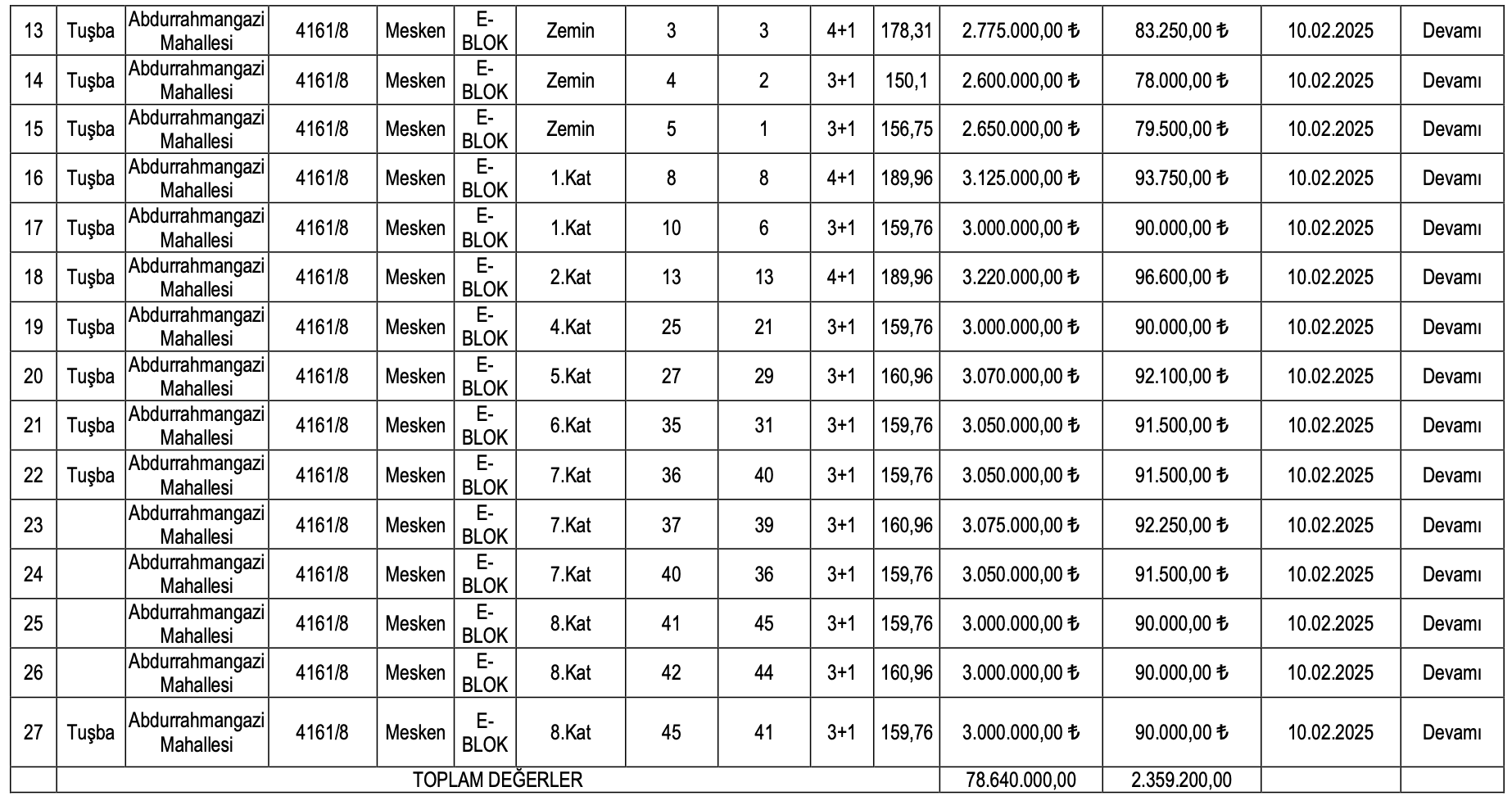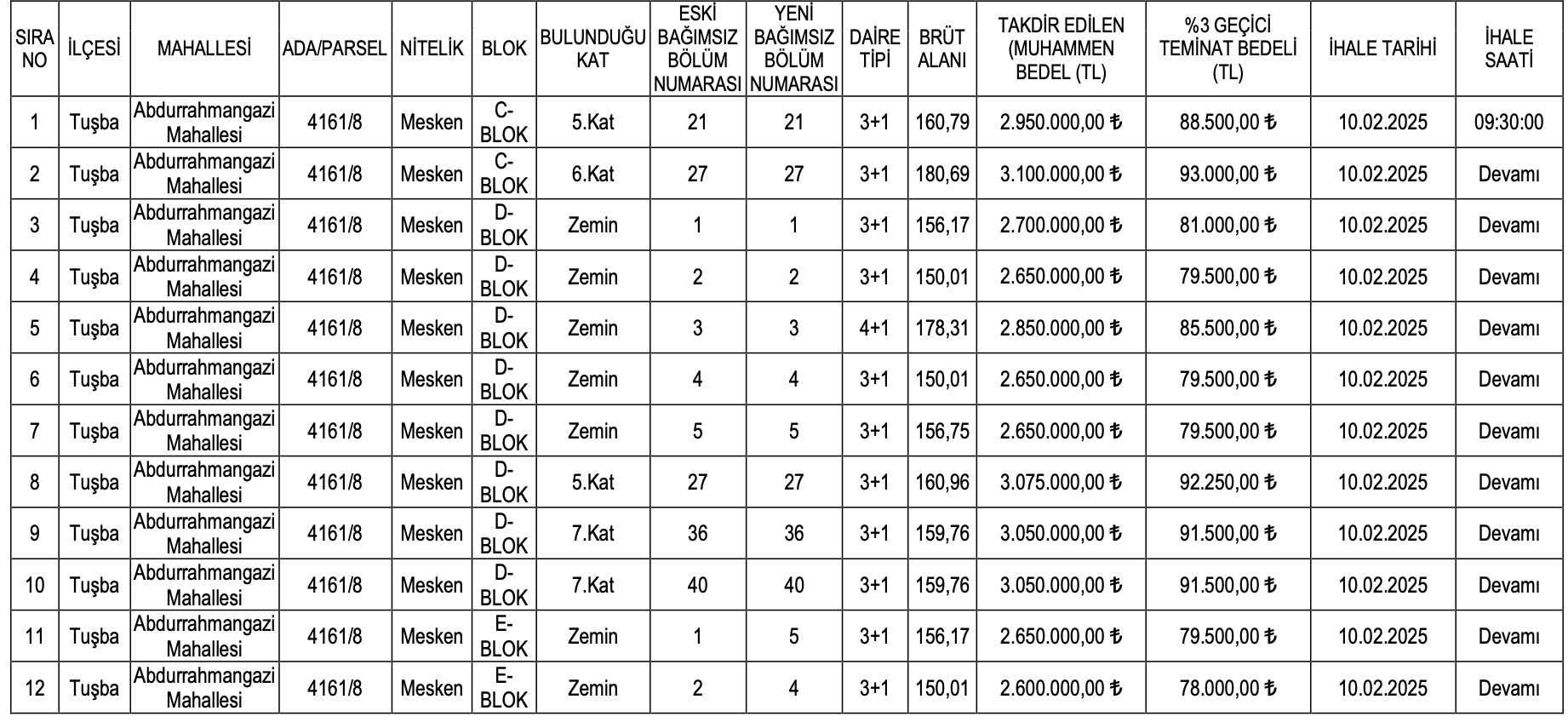 3 oda 1 salon ve 4 oda 1 salon şeklinde belirtilen konutların muhammen bedelleri 2 milyon 600 bin TL ile 3 milyon 220 bin TL arasında değişirken, geçici teminat bedelleri ise 78 bin TL ile 96 bin 600 TL arasında değişiyor.