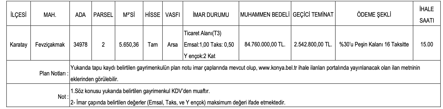Konya Karatay’da yer alan ticaret alanı imarlı arsa 5 bin 650,36 metrekare alana sahip. Ticaret alanı imarlı arsanın muhammen bedeli 84 milyon 760 bin TL olarak açıklanırken, geçici teminat bedeli ise 2 milyon 542 bin 800 TL olarak açıklandı.