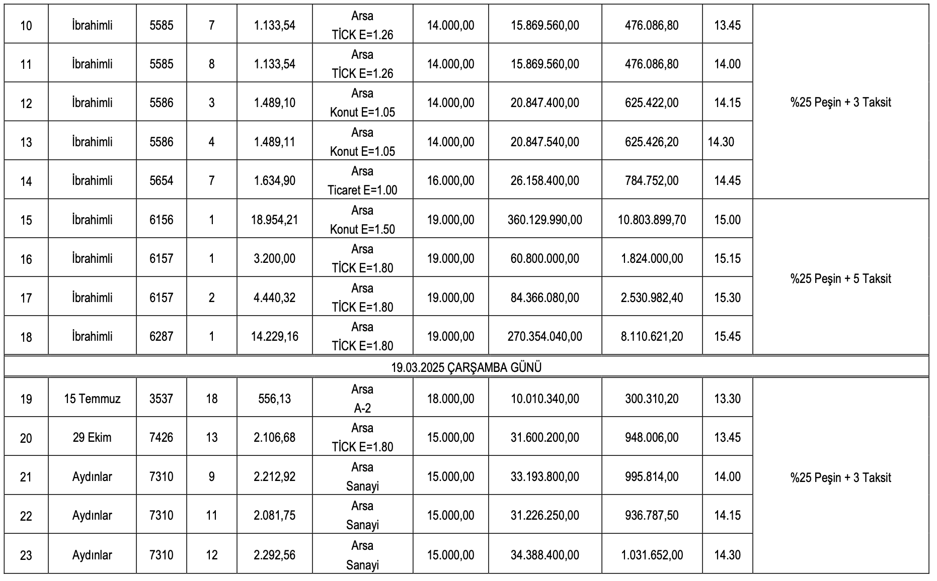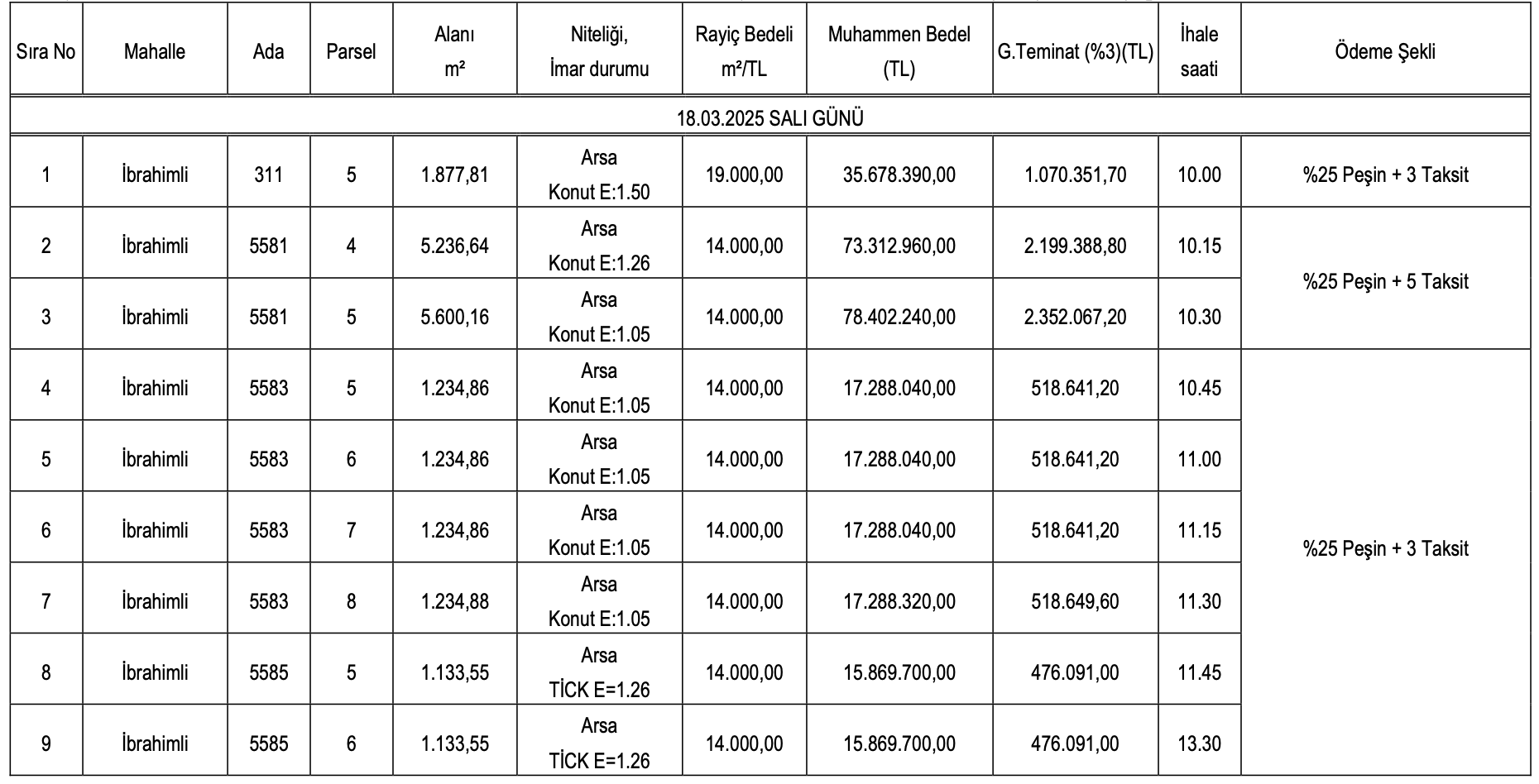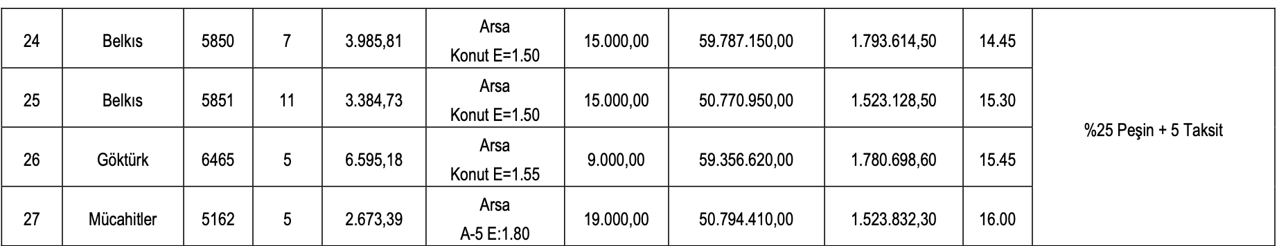 Muhammen bedelleri 10 milyon 10 bin 340 TL ile 360 milyon 129 bin 990 TL arasında değişen arsaların geçici teminat bedelleri ise 300 bin 3120,20 TL ile 10 milyon 803 bin 899,70 TL rasında farklılık gösteriyor.