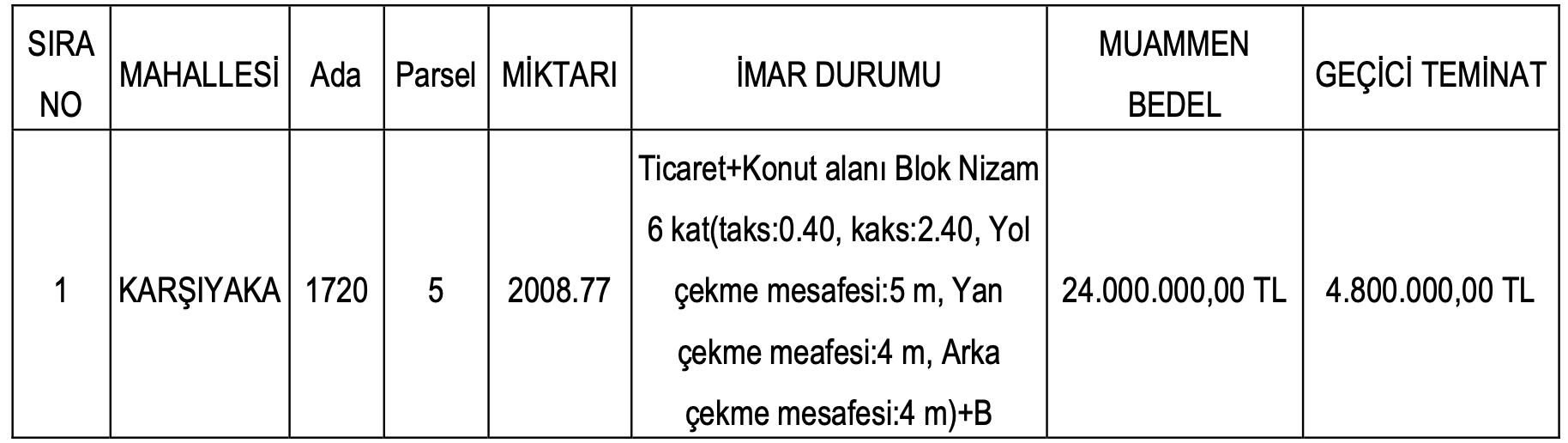 Satışa çıkarılan arsanın muhammen bedeli 24 milyon TL olarak açıklanırken, geçici teminat bedeli ise 4 milyon 800 bin TL olarak açıklandı.