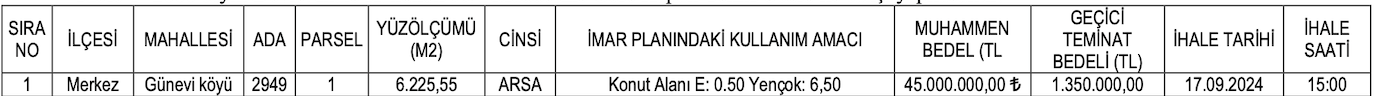 Konut alanı arsanın muhammen bedeli 45 milyon TL, geçici teminat bedeli ise 1 milyon 350 bin TL. Günevi Köyü’nde yer alan arsanın satış ihalesi 17 Eylül 2024 tarihinde saat 15.00’te gerçekleştirilecek.